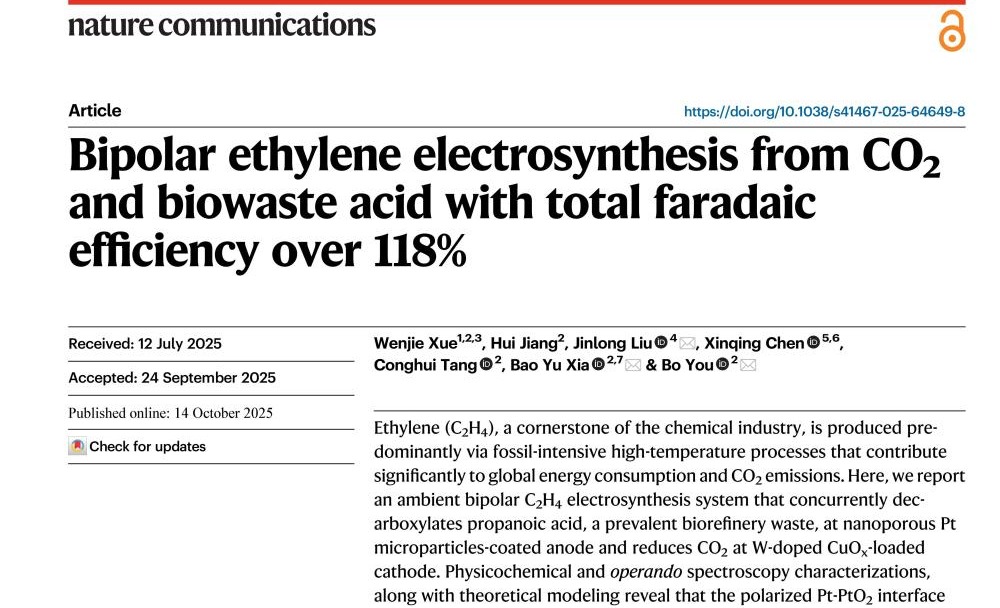 化工学院薛文杰博士在《Nature Communications》发表双极乙烯电合成研究成果